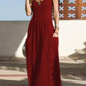 Solid Color Casual Pocket Pleated Dress Women’s Clothing