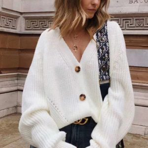 Solid V-Neck Lantern Sleeve Button Knit Cardigan