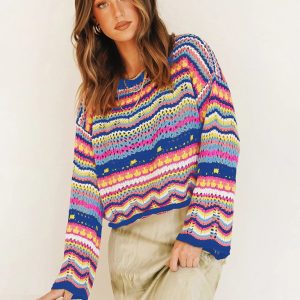 Splicing Knit Sweater Loose Intercolor Foreign Trade Round Neck Striped Sweater Women