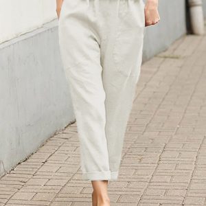 Women’s Big Pocket Solid Color Comfortable Cotton Linen Casual Pants Straight Leg Trousers