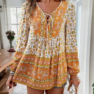 Women’s bohemian printed lace-up blouse