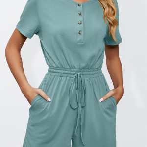 Women’s Knit Loose Short Sleeve Button Tie Jumpsuit