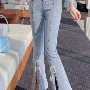 Women’s new fashionable and versatile slit heavy beaded straight-leg micro-flared trousers