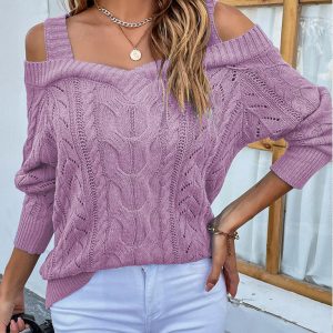 Women’s Off-the-shoulder solid color braided long-sleeve sweater