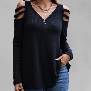 Women’s Off Shoulder Zipper Long Sleeve Waffle T-Shirt Top