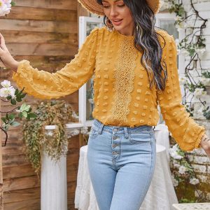 Women’s round neck balloon sleeve solid color lace shirt