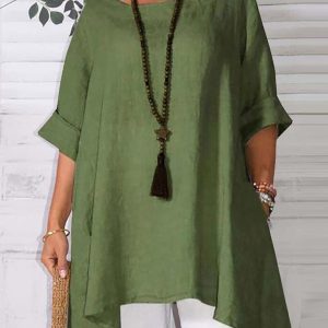 Women’s Round Neck Asymmetric Hem Solid Short Sleeve Shirt