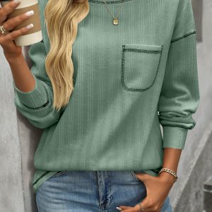 Women’s ribbed brushed solid color round neck pocket casual loose T-shirt