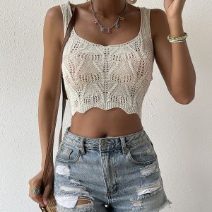 Women’s Solid Color Hemp Pattern Hollow Navel Cropped Vest Knitted Top
