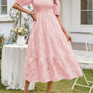 Women’s Solid Color Jacquard Chiffon Round Neck Pleated Dress