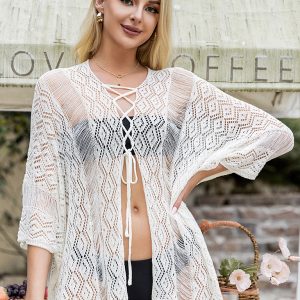 Women’s solid color hollow lace-up woolen cardigan top