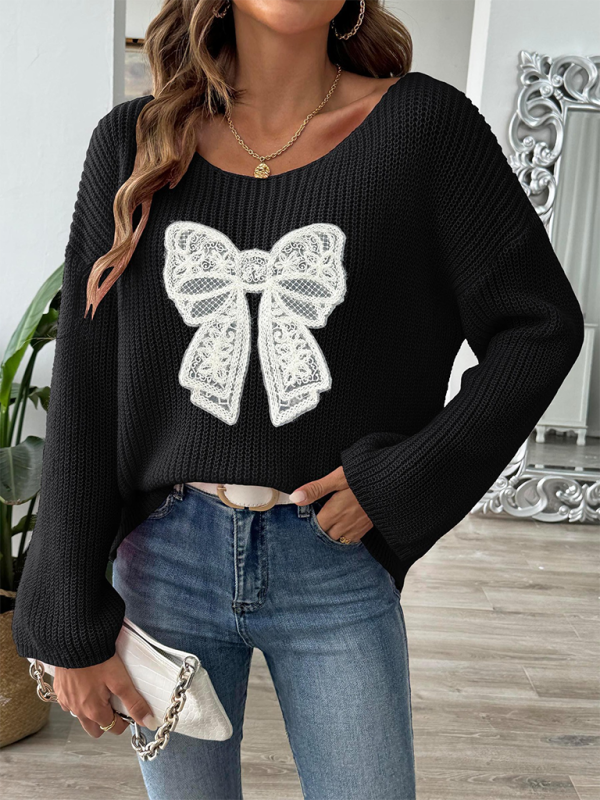 Bow Embroidery Applique Women’s Pullover Sweater One Neck Strapless Flare Sleeve Sweater