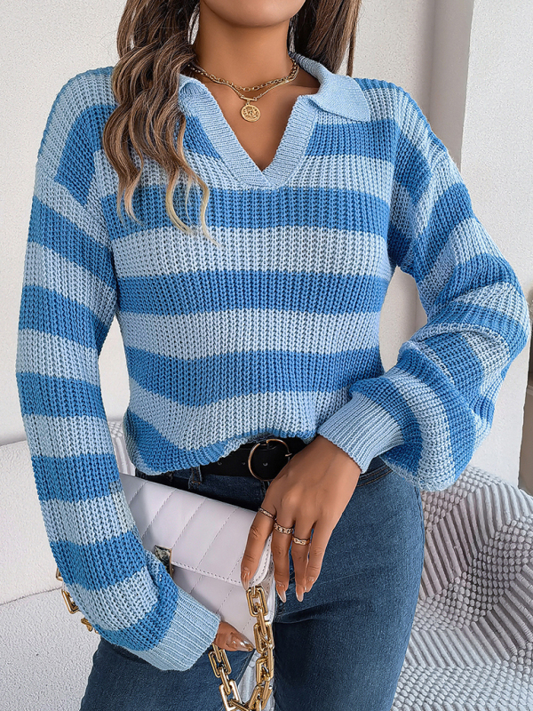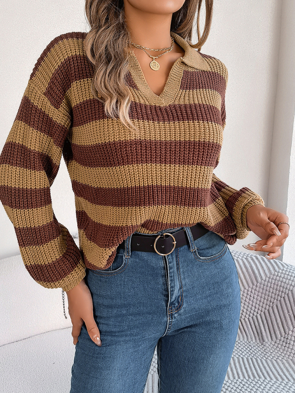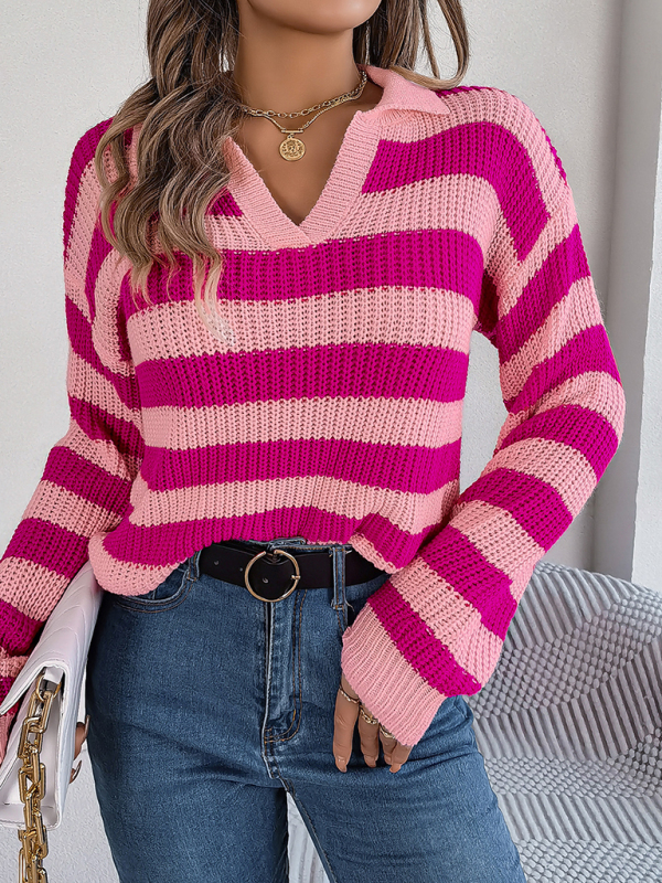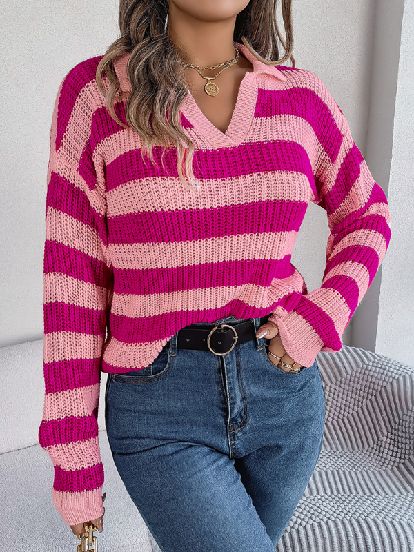 Casual Lapel Collar Contrast Stripe Long Sleeve Knit Pullover