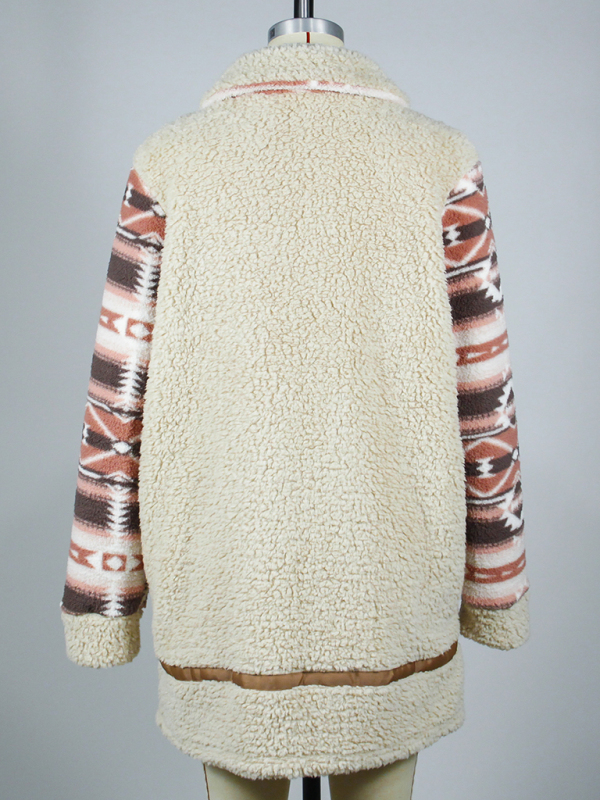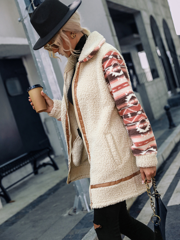 Color block printed lapel long zippered plush jacket