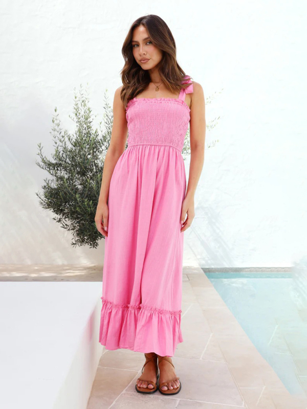 The long dress is designed with solid-color shoulder straps as suspenders, without any decorative patterns or patterns, making it simple and elegant. The solid color design makes the long dress more versatile and can be matched with various accessories and shoes to show different styles.