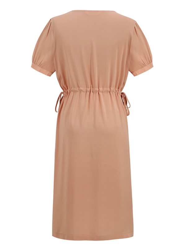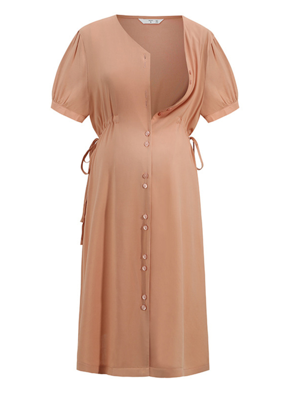 Maternity dress with drawstring waist short sleeve button down dress with stylish style and soft and comfortable fabric. It can be worn daily, going out, dating, vacation, etc. Washing method can be machine wash or hand wash. Fabric is wrinkle and pill resistant. The size is measured by hand, and it is normal for there to be an error of 1-3cm.