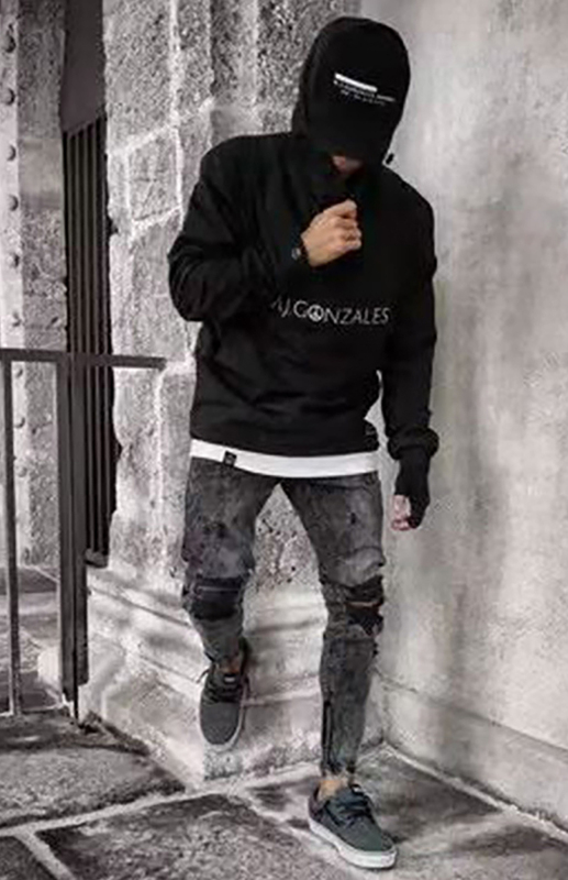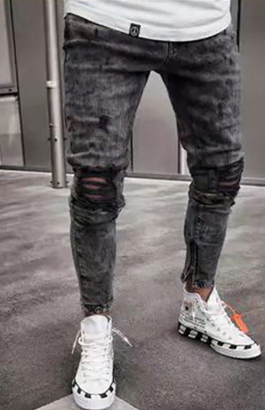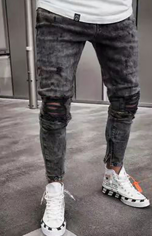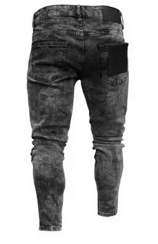 Keywords: Men’s mid-waist jeans, ripped slim jeans, all-season wear, cotton blend.