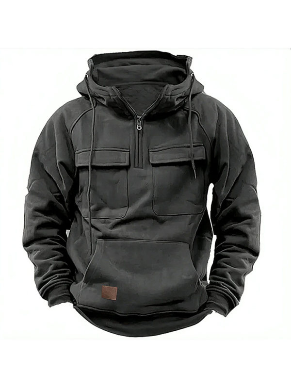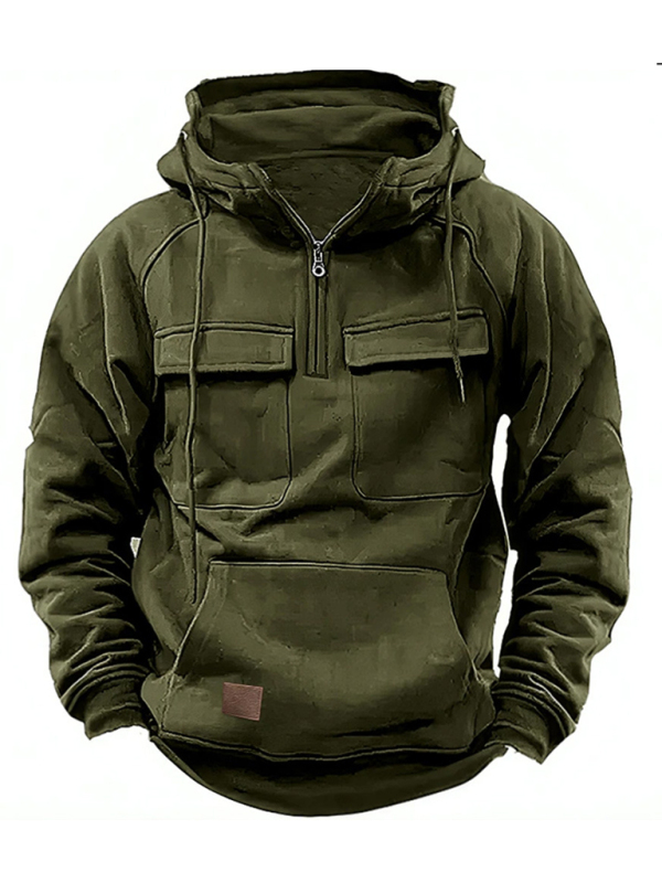 Men’s hooded solid color sports multi-pocket leather sweatshirt jacket