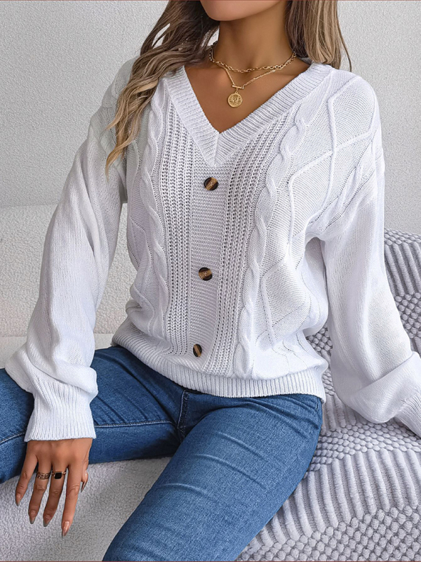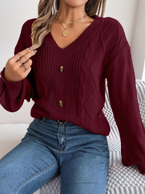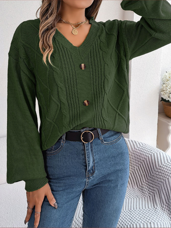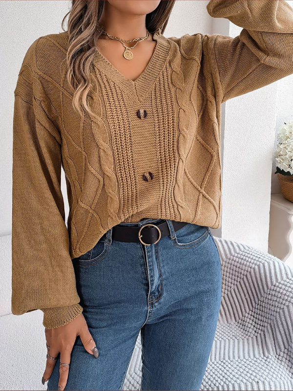 The new autumn and winter solid color V-neck buttoned twist lantern sleeve pullover sweater is suitable for various occasions. The simple design makes the boring season colorful and interesting. A variety of matching options make you confident and beautiful. Please use the sizing guide shown in our images. Please read each element in the size guide carefully before choosing a size. The size is measured manually, and it is normal for there to be an error of 1-3cm.