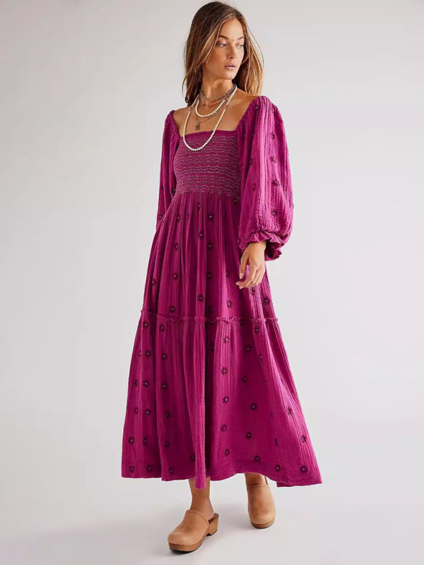 New casual embroidered square collar sunflower rose red dress