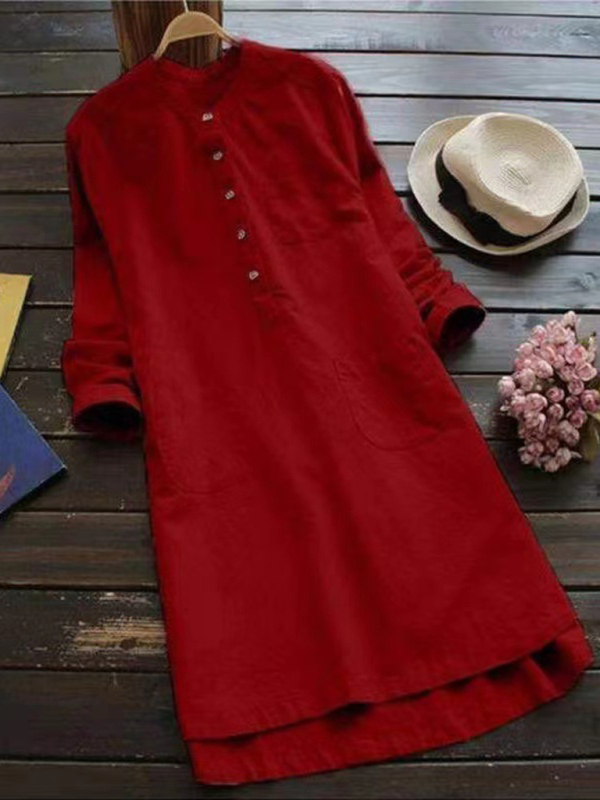 New Solid Color Henley Collar Button Open Long Sleeve Shirt Style Midi Dress