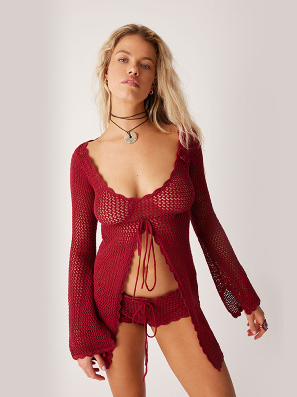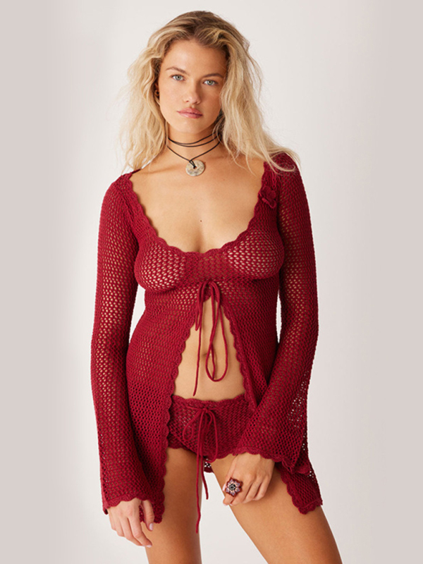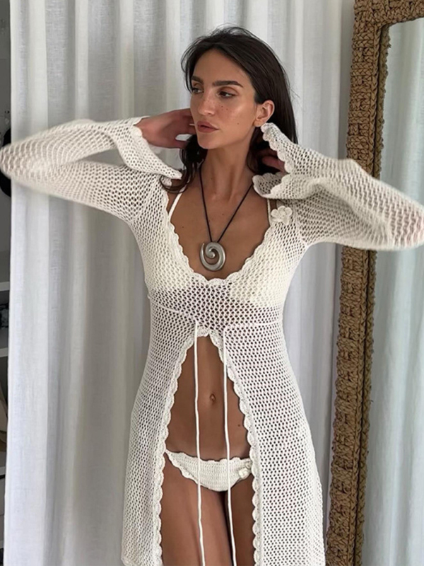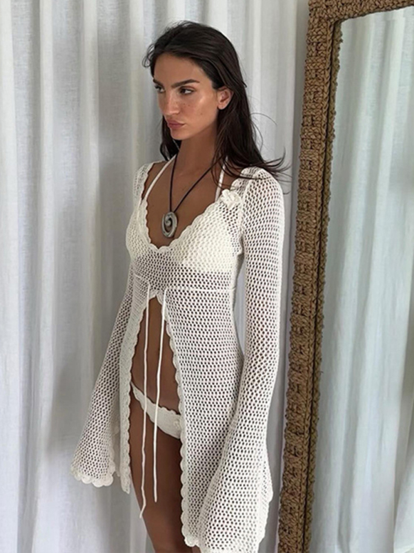 The new solid color sexy knitted hollow bikini swimsuit cover-up sun protection clothing is suitable for wearing on vacation, beach, resort, swimming pool and other occasions. It can show women’s ease, freedom and fashion style.