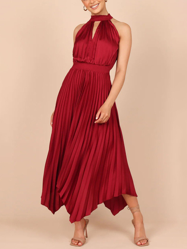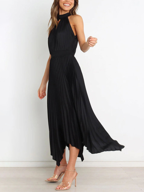 New women’s folded solid color sleeveless halterneck V-neck irregular skirt dress