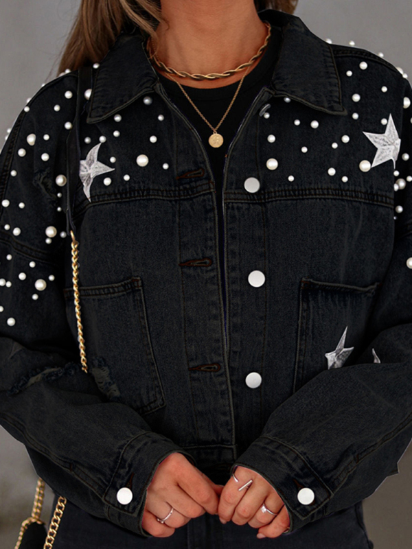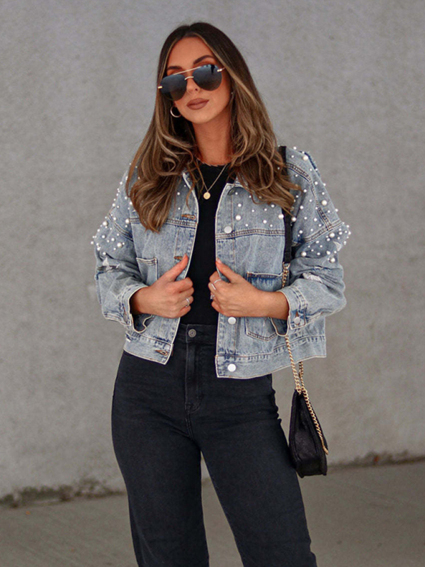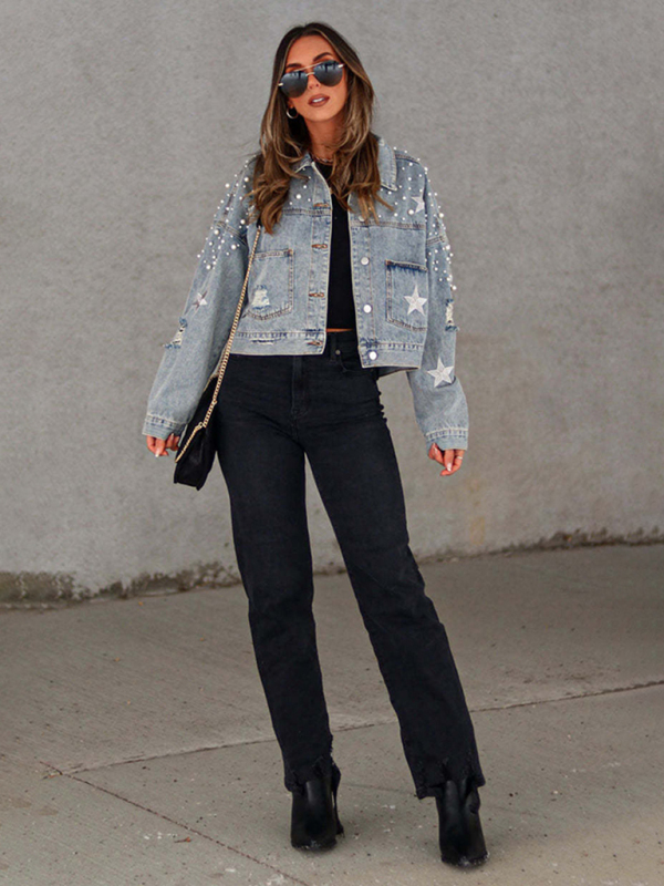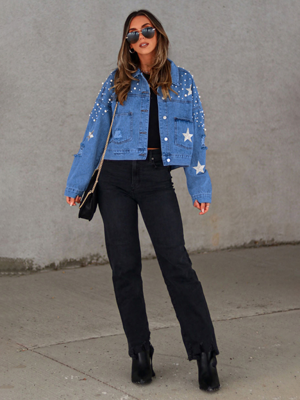 Elevate your denim game with this Women’s heavy beaded loose denim jacket. Crafted with a blend of 95% polyester and 5% spandex, this jacket features intricate beadwork for added flair. Perfect for casual or dressy occasions, this jacket adds a touch of sophistication to any outfit.