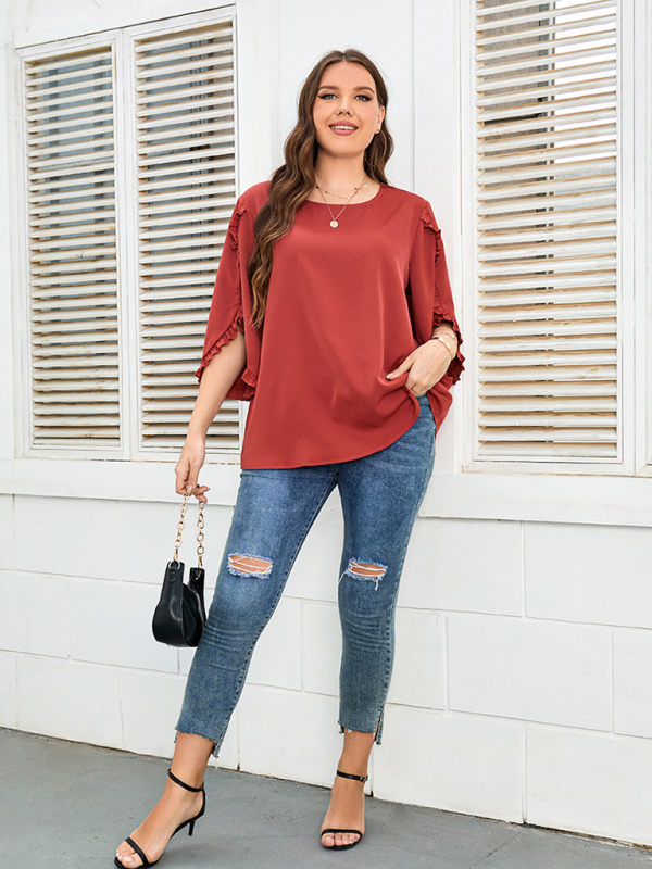 Plus Size Ladies Shirt Red Half Sleeve Loose Top
