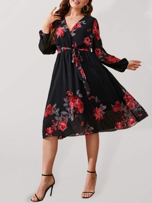 Plus Size Sexy V Neck Floral Print Tie Slim Dress