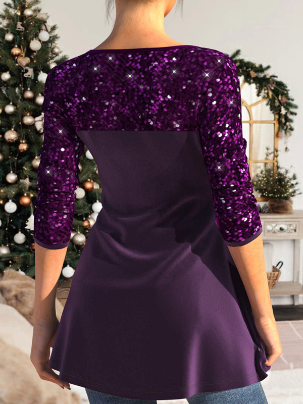 Sequin patchwork top waist-cinching pleated V-neck A-hem women’s T-shirt
