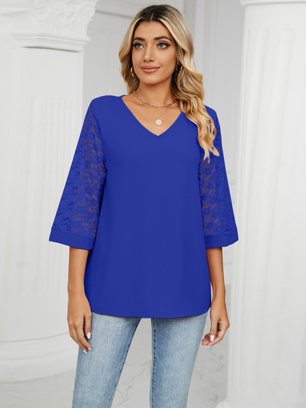 Spring and summer new loose v-neck seven-point lace trumpet sleeve stitching chiffon shirt