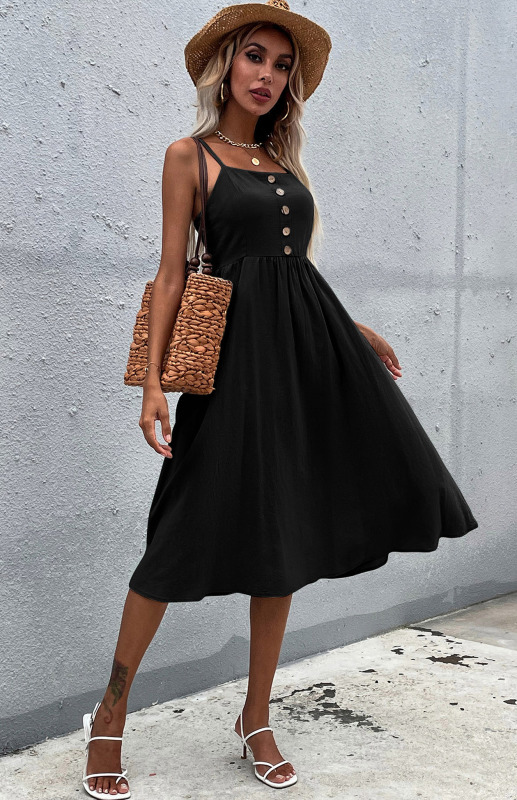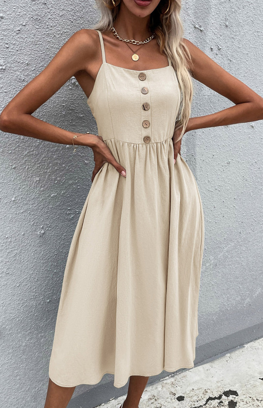 Crafted from lightweight cotton linen, this sleeveless dress is an elegant choice for spring and summer. Its solid color and button-down front enhance the classic, leisure style. Perfect for casual outings and social media-worthy events. Available for Wholesale or Dropshipping.