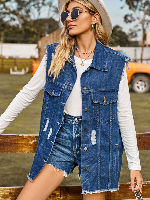 This new denim sleeveless vest is a summer fashion must-have. Made of 95% Rayon and 5% Polyester, this vest is perfect for layering over your favorite tops. The denim material gives it a trendy look that can be easily dressed up or down for any occasion.