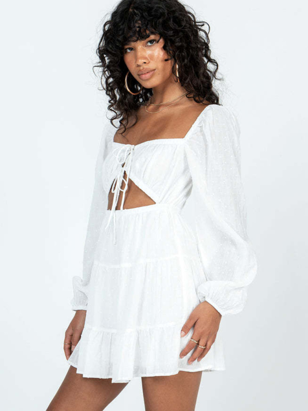 Women’s Elegant Square Neck Long Sleeve Lace Up Hollow Short White Dress is suitable for many occasions, and the simple design makes the boring season colorful and interesting. A variety of matching options make you confident and beautiful. Please use the sizing guide shown in our images. Please read each element in the size guide carefully before choosing a size. The size is measured manually, and there is an error of 1-3cm, which is normal.