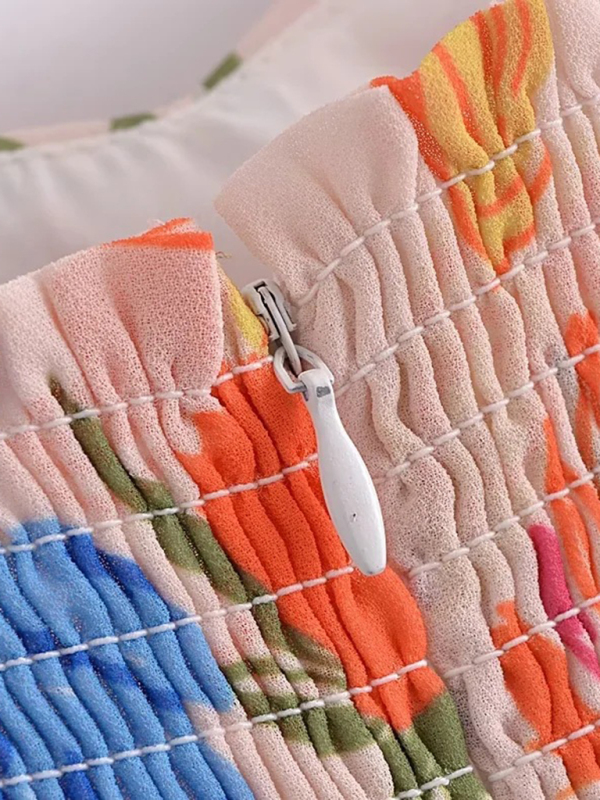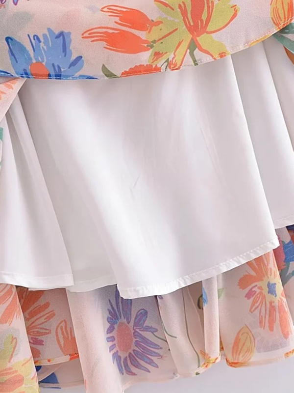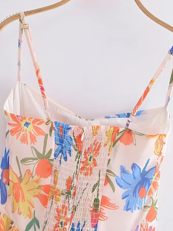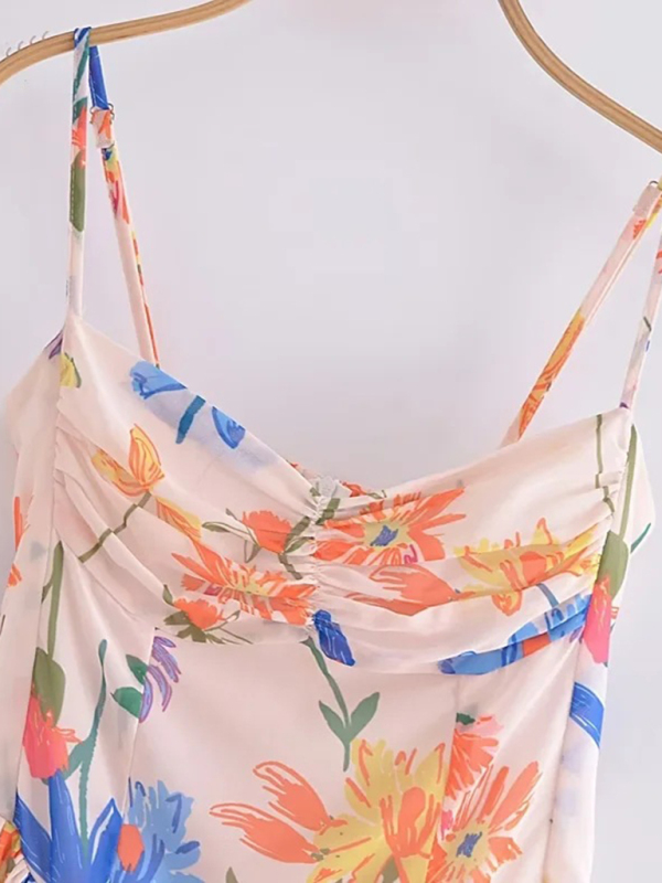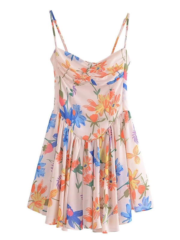 Women’s French seaside resort style romantic printed suspender waist pleated short dress