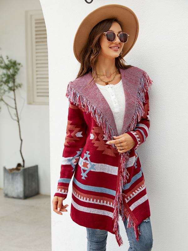 Women’s fringed geometric jacquard sweater cardigan. Please use the size guide shown in our pictures. Before choosing a size, please read each element of the size guide carefully. Unique design, classic style, casual and comfortable. It is suitable for outing and leisure. The size is measured manually, and the error of 1-3cm is normal.