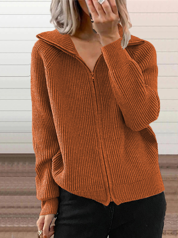 Women’s loose knitted zipper long sleeve lapel cardigan
