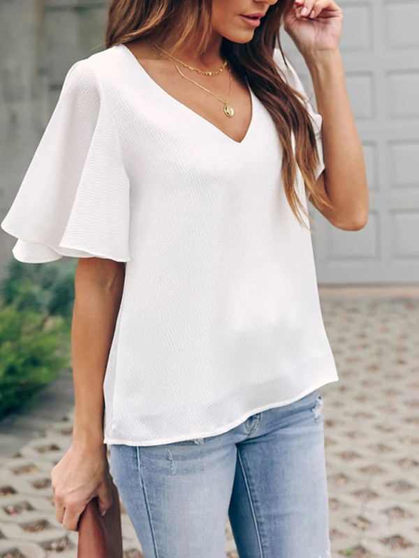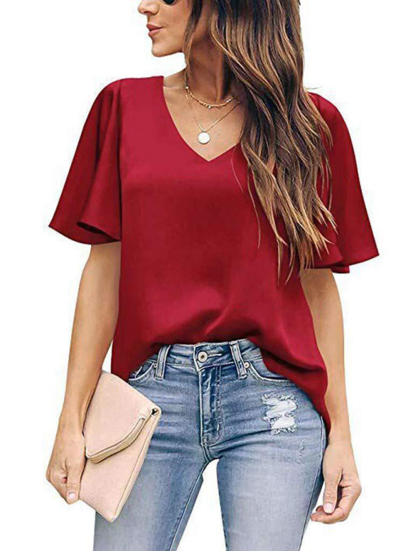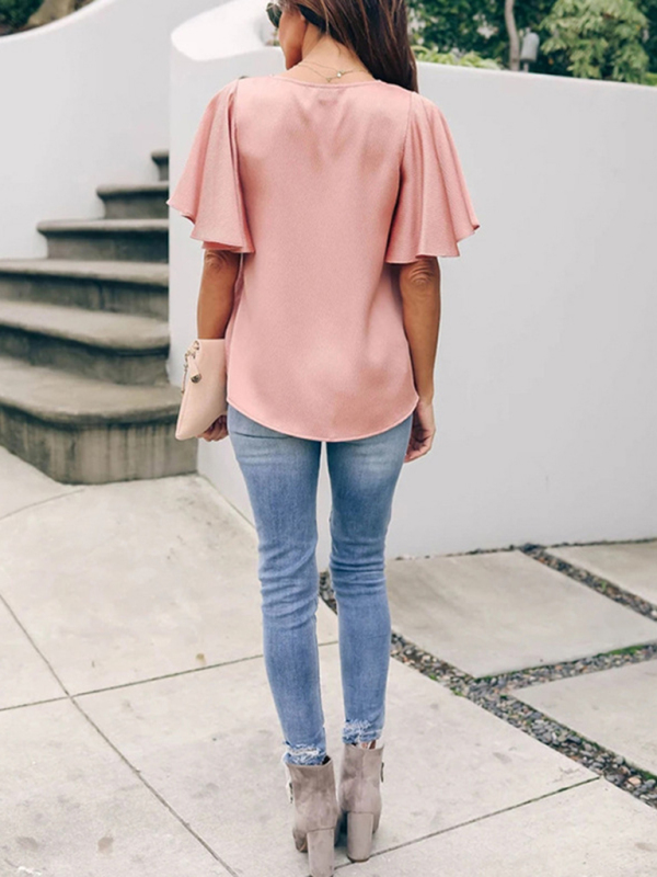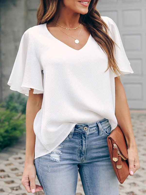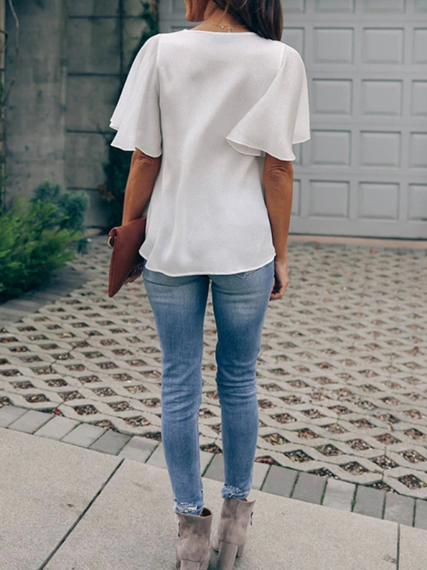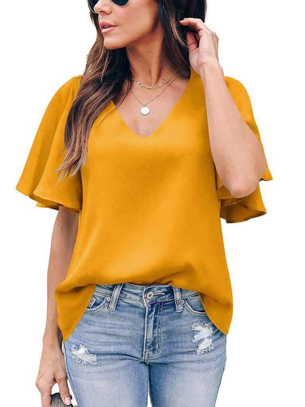 One of the standout features of this casual top is the ruffle sleeves. The ruffles add a playful and trendy element to the overall design, giving the top a unique and fashionable flair. The ruffle sleeves also bring movement and flow to the garment, enhancing its visual appeal.
