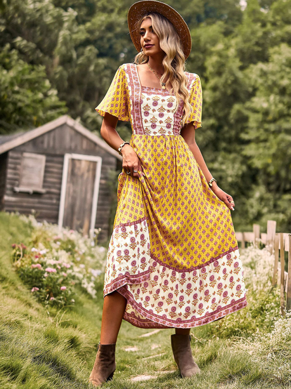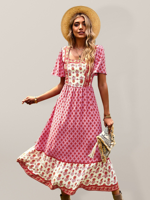 Women’s Neck Bohemian Short Sleeve Midi Dress