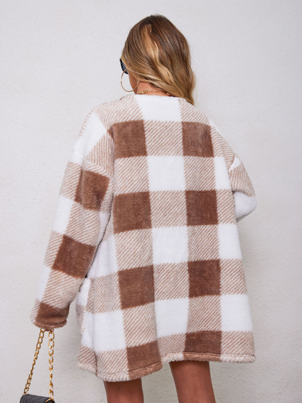 Women’s New Casual Plush Plaid Pocket Long Sleeve Cardigan Jacket