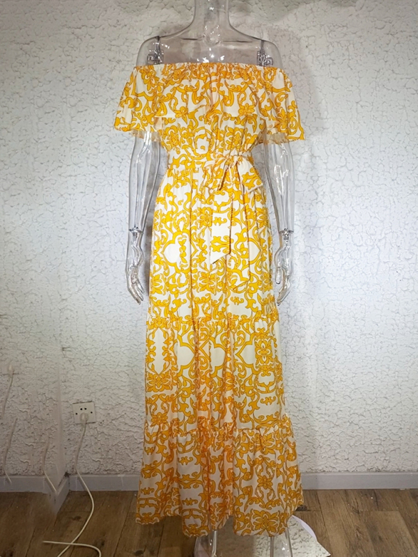 Women’s Printed Boat Neck Tie Ruffle Trim Long Swing Dress