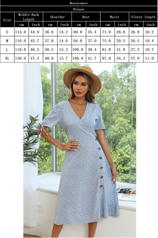 Women’s Puff Sleeve Floral V-Neck Short Sleeve Lace-Up Slit Button Dress