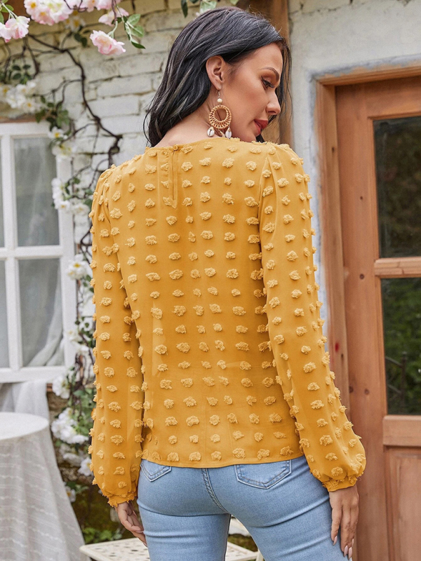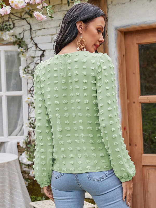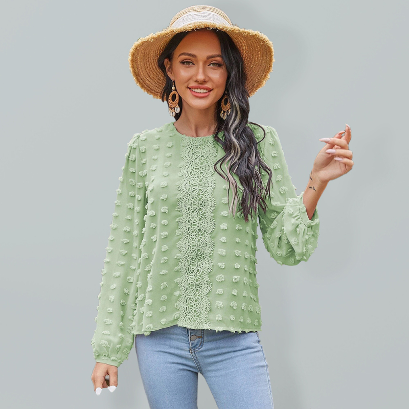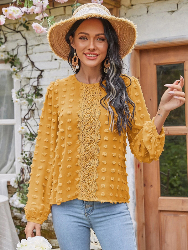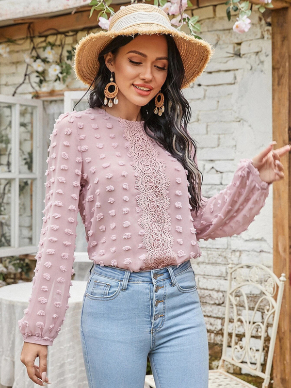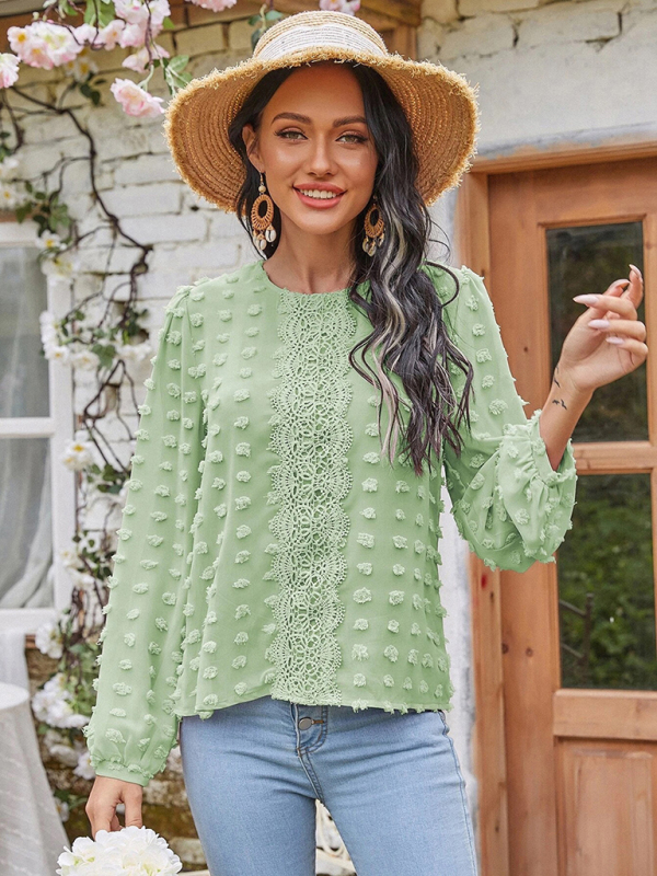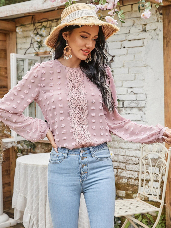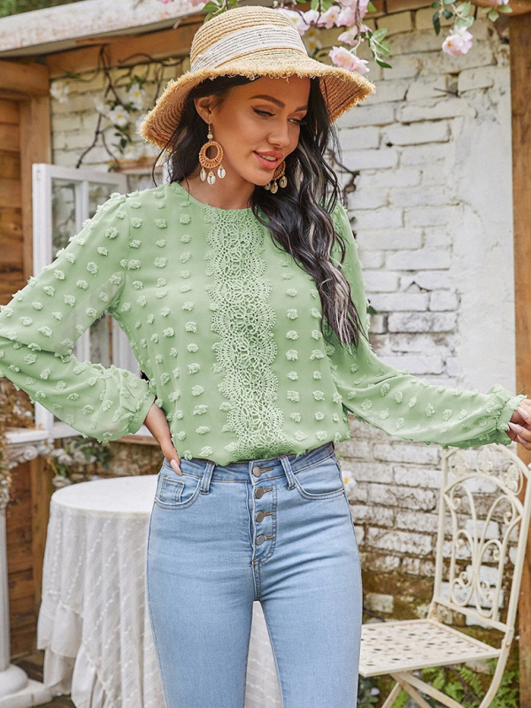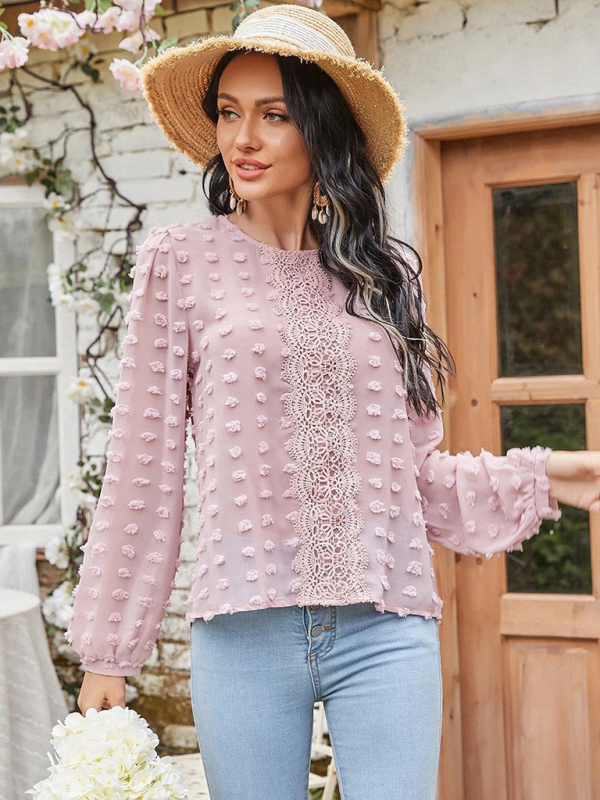 Women’s round neck balloon sleeve solid color lace shirt with fashionable style and soft and comfortable fabric. Whether it is daily, shopping, work, dating, etc., it can be worn by machine or hand. Fabric is wrinkle resistant and resistant to pilling. The size is measured by hand, and it is normal for there to be an error of 1-3cm.