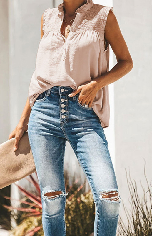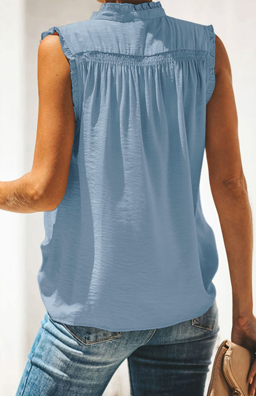 Embrace effortless elegance with our Women’s Sleeveless Ruffle Top. Featuring a stylish V-neck and button-up design, this soft polyester blouse is perfect for casual outings. Its delicate ruffle trim adds a touch of femininity, making it a must-have for any wardrobe. Wholesale and dropshipping available.