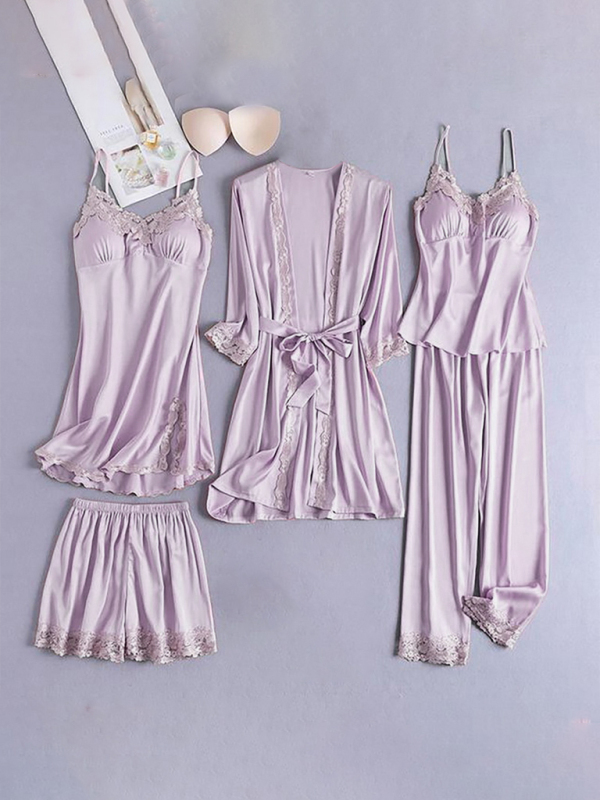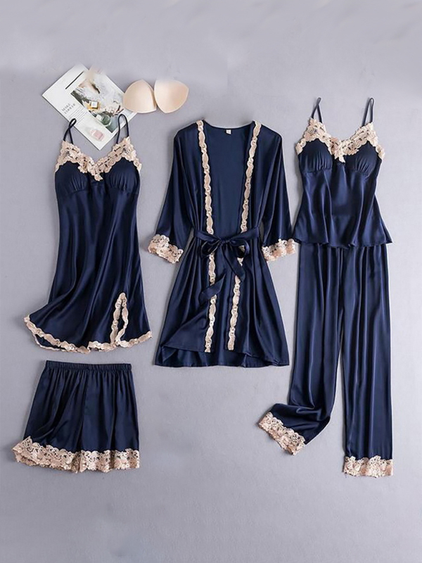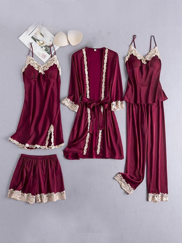 Sexy Contrasting Color Lace Pajamas Five-Piece Set, fashionable and pretty. The fabric is soft and comfortable. Whether it is daily, party, etc., it can be machine washed or hand washed. Fabric resists wrinkling and pilling. The size is measured by hand, and it is normal for there to be an error of 1-3cm.