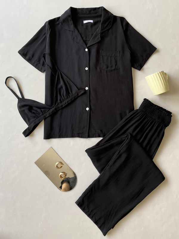 Women’s solid color knitted casual pajamas three-piece set, Fashionable Style, Soft and Comfortable Fabric. Whether it is daily, home, pajama party, etc., it can be worn by machine or hand. Fabric is wrinkle resistant and resistant to pilling. The size is measured by hand, and it is normal for there to be an error of 1-3cm.