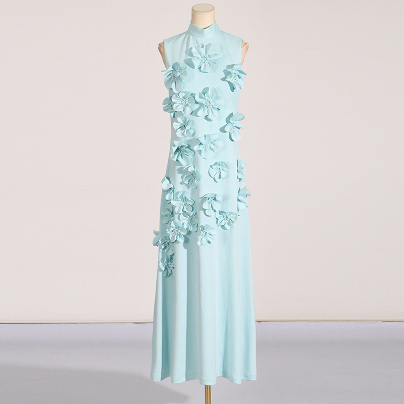 Women’s Stand Collar Sleeveless Solid Color Three-Dimensional Flower Collage Design Long Dress