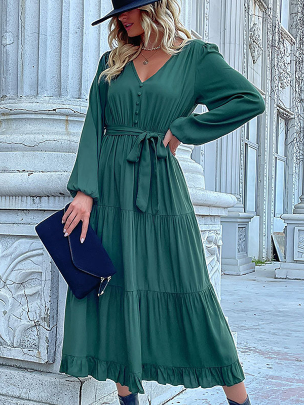 Women’s Woven V-Neck Long-Sleeved Pleated Dress