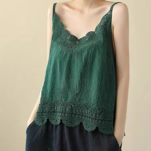 Cotton and Linen Vest Women’s Retro Outerwear Suspenders Embroidered Lace Hollow Top